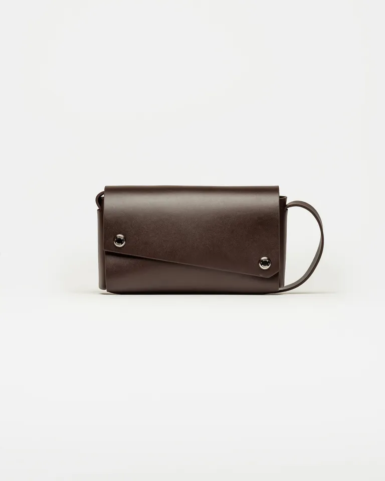 Bandolera de diseño minimalista y estructura rígida, ideal para llevar objetos personales esenciales. Presenta una silueta compacta con cierre metálico, aportando un estilo sofisticado y funcional para acompañar todo tipo de outfits urbanos y formales.