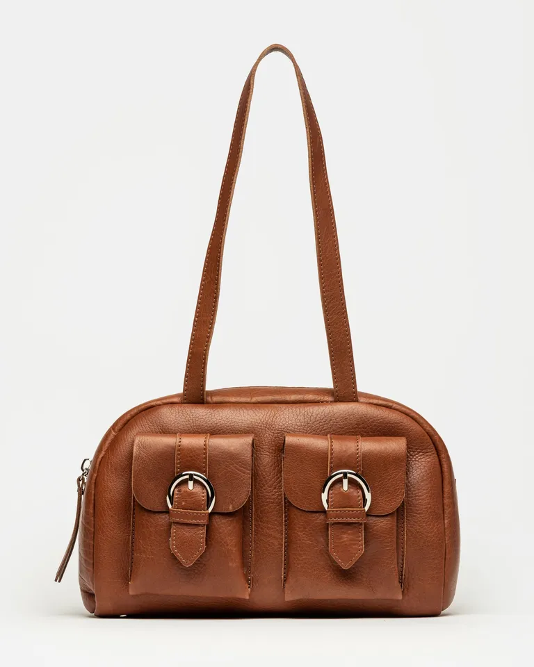 Cartera de formato compacto con dos bolsillos frontales decorados con hebillas metálicas. Presenta una silueta estructurada, manijas para llevar al hombro y una capacidad interior práctica para organizar tus pertenencias diarias. Un accesorio de estilo vintage que aporta distinción y funcionalidad a diversos outfits.