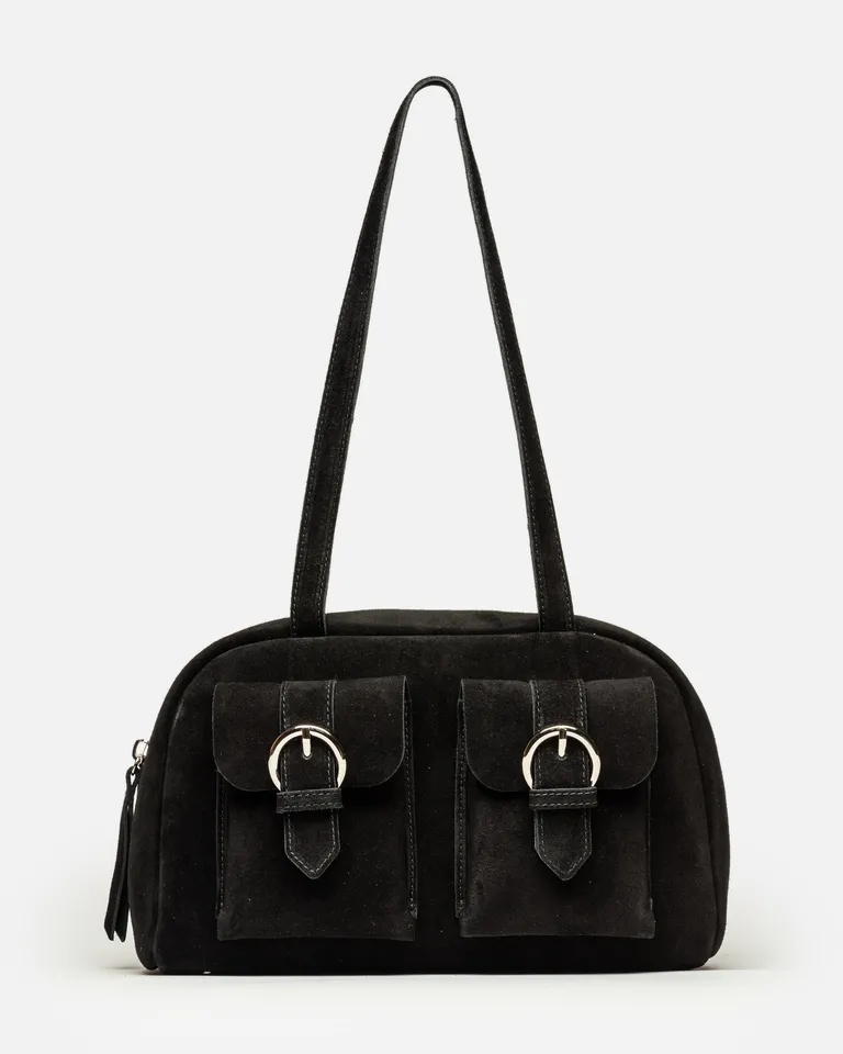 Bolso de mano con diseño vintage y silueta compacta. Cuenta con dos bolsillos frontales con detalle de hebillas metálicas que aportan carácter al diseño. Un accesorio versátil, cómodo y funcional para completar tus outfits diarios con un toque sofisticado y atemporal.