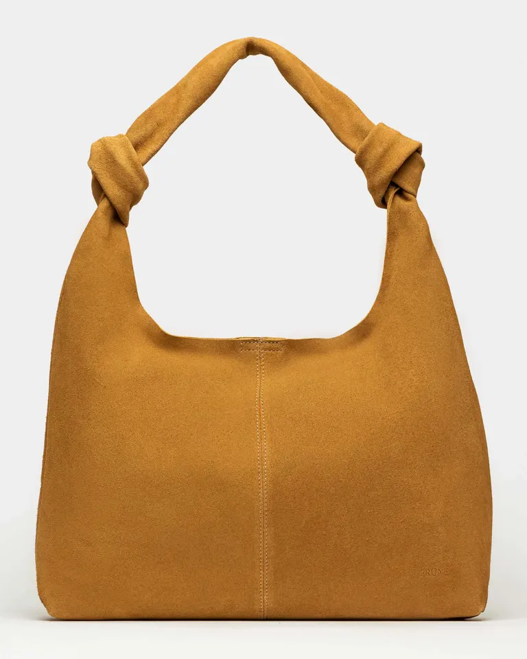 Cartera al hombro con diseño de nudos en manijas y silueta blanda minimalista de Prüne