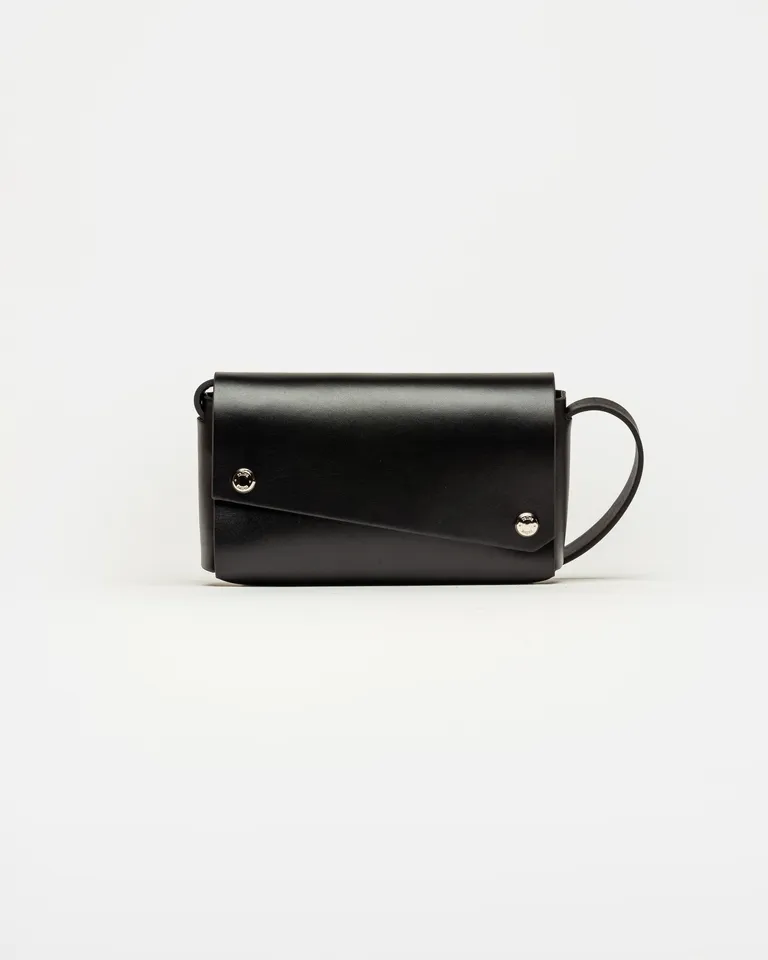 Bandolera pequeña con diseño minimalista, estructura rígida y cierre mediante solapa con broches metálicos. Ideal para complementar looks urbanos y modernos, ofreciendo un accesorio compacto y funcional para el uso diario.