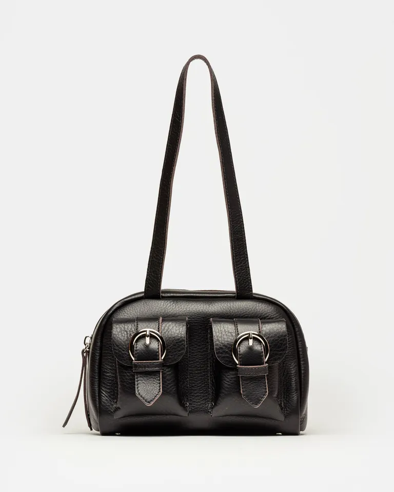 Cartera al hombro con diseño compacto y funcional. Presenta una estructura con dos bolsillos frontales decorados con hebillas metálicas, ofreciendo un estilo vintage y distinguido para el uso diario. Es un accesorio versátil que combina capacidad de guardado con una estética clásica, ideal para complementar cualquier outfit con un toque sofisticado.