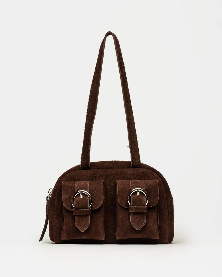 Cartera de hombro de silueta compacta con diseño vintage. Presenta dos bolsillos delanteros funcionales adornados con hebillas metálicas. Ideal para quienes buscan un accesorio con personalidad y buena capacidad de guardado, perfecto para completar looks urbanos con un estilo nostálgico.