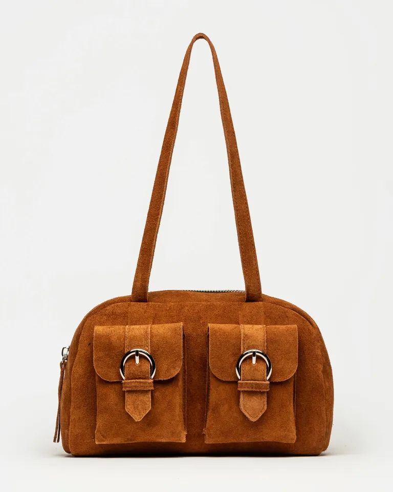Cartera de formato compacto con dos bolsillos frontales decorados con hebillas metálicas. Presenta un diseño de inspiración vintage con correas para llevar al hombro, ideal para complementar outfits cotidianos con un toque de carácter y estilo distinguido.