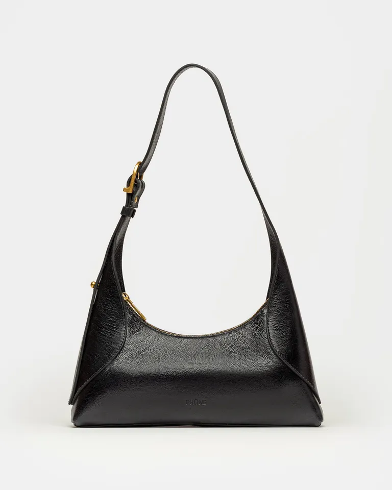 Cartera de mano con diseño curvo y estructura definida. Presenta una manija regulable al hombro con detalle de hebilla metálica y cierre superior. Ideal para complementar outfits diarios con un accesorio versátil, moderno y funcional que permite organizar tus elementos personales con facilidad.