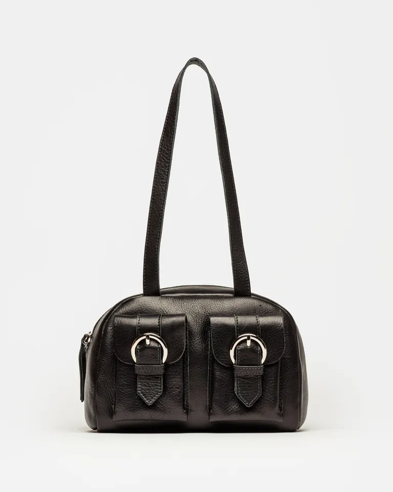 Cartera de hombro con diseño vintage, silueta compacta y dos bolsillos frontales con hebillas decorativas. Un accesorio funcional con capacidad de guardado ideal para completar outfits urbanos y versátiles con un estilo distintivo.