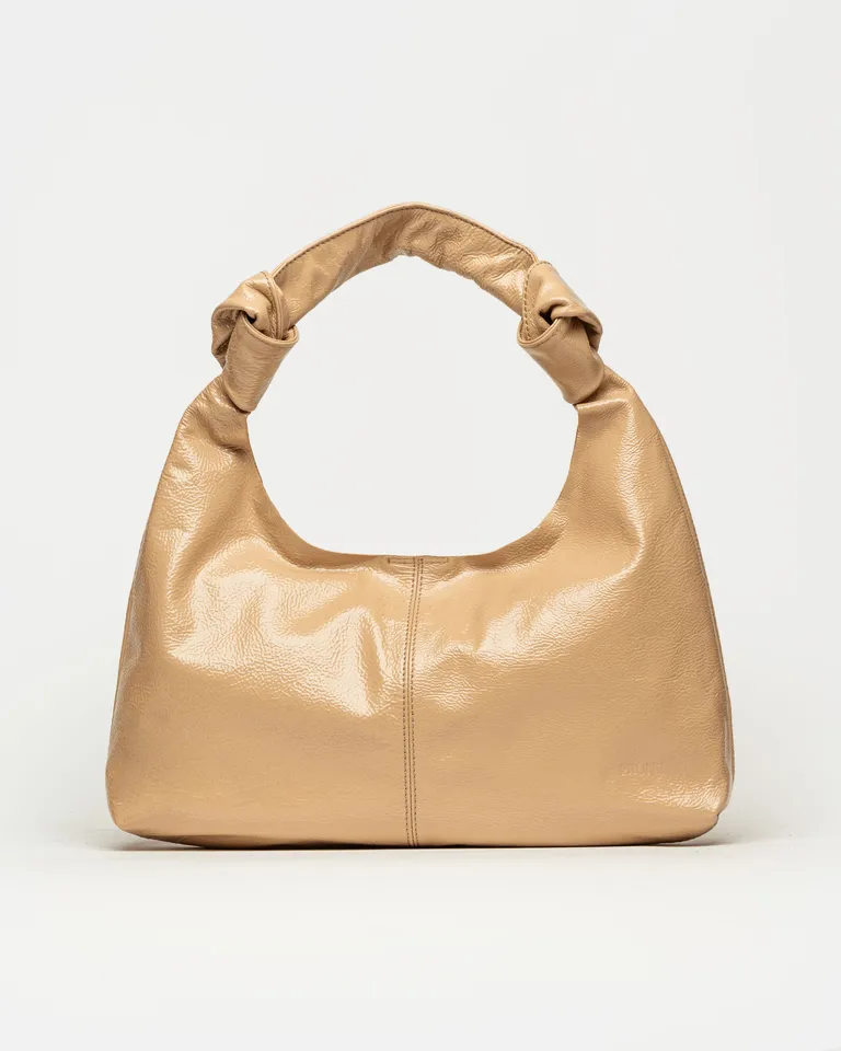Cartera de diseño orgánico con silueta blanda y acabado brillante. Presenta manijas con detalle de nudos laterales, estilo minimalista y compartimento organizador interno. Un accesorio funcional y versátil ideal para completar tus conjuntos diarios con un toque moderno.