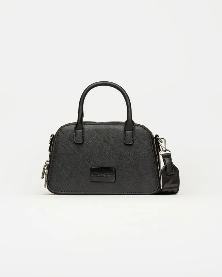 Cartera de mano de estructura rígida con detalle de chapón metálico en el frente. Cuenta con doble cierre y una correa de cinta regulable y desmontable que permite versatilidad en su uso. Ideal para completar outfits urbanos o formales con un toque distintivo.