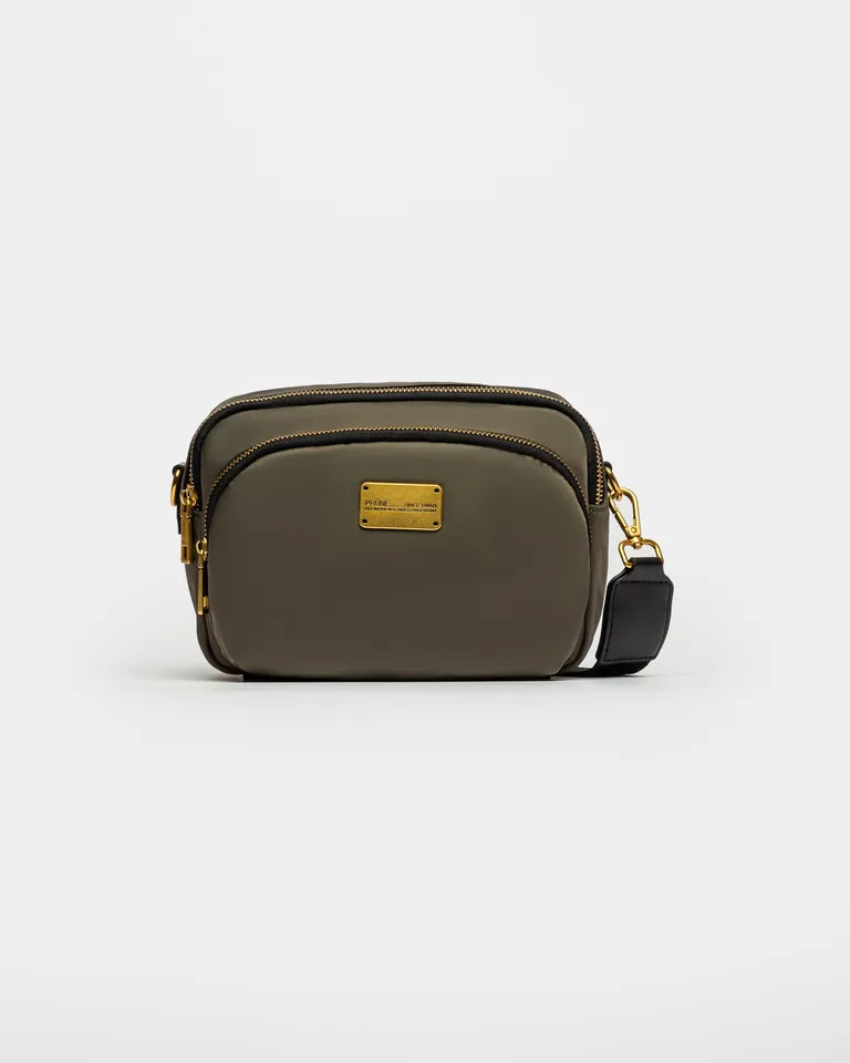 Mini cartera de diseño compacto con tres compartimentos organizadores, ideal para el uso diario. Cuenta con herrajes metálicos con acabado en bronce, cierre superior y correa ajustable con detalles en jacquard. Un accesorio funcional y versátil para complementar looks casuales o formales en Argentina.