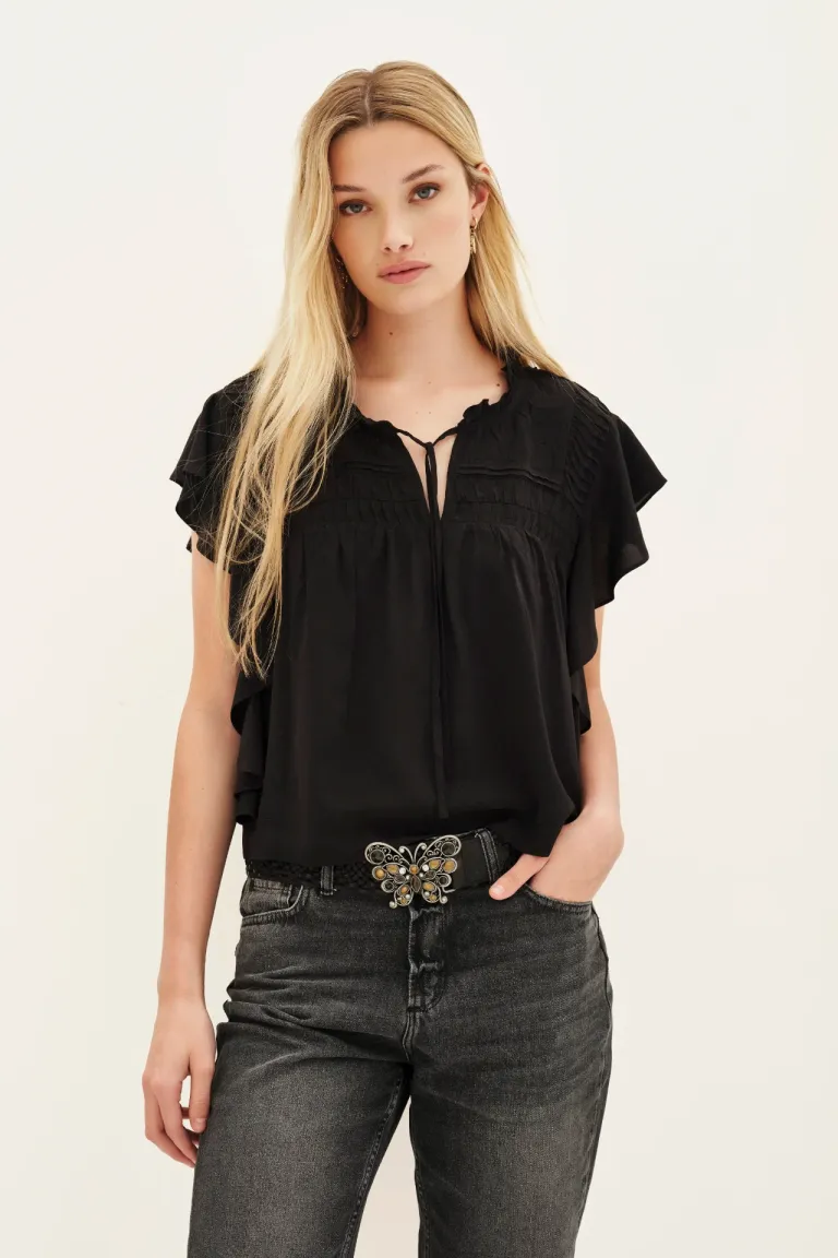 Blusa de mangas cortas con diseño de volados en sisa y laterales. Presenta detalles de alforzas en canesú tanto en el frente como en la espalda. Su cuello redondo cuenta con un delicado volado y cierre mediante lazos frontales, ofreciendo una opción versátil y cómoda para diversas ocasiones.
