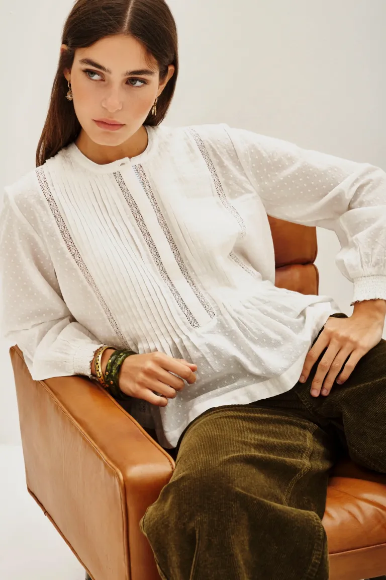 Blusa de manga larga con detalles de alforzas y puntillas en el frente. Presenta una silueta ajustada en la cintura con frunces y terminaciones de puños con punto smock. Una opción versátil y distinguida para sumar al guardarropa diario con un estilo femenino y atemporal.