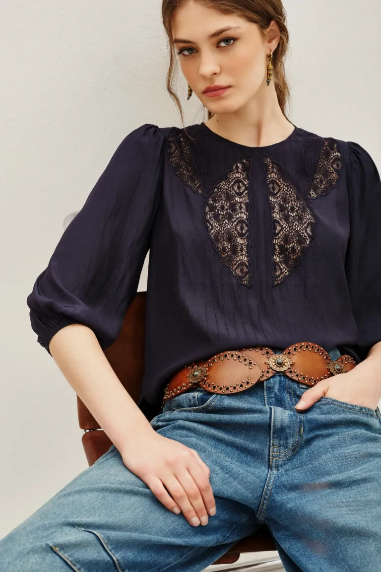 Blusa de calce relajado con mangas largas con frunces y elástico en puños. Presenta un delicado diseño con detalles de puntillas, encaje y alforzas en el frente. El cierre se ubica en la espalda mediante un escote gota con un botón. Una prenda versátil y sofisticada para completar outfits cotidianos con un toque femenino.
