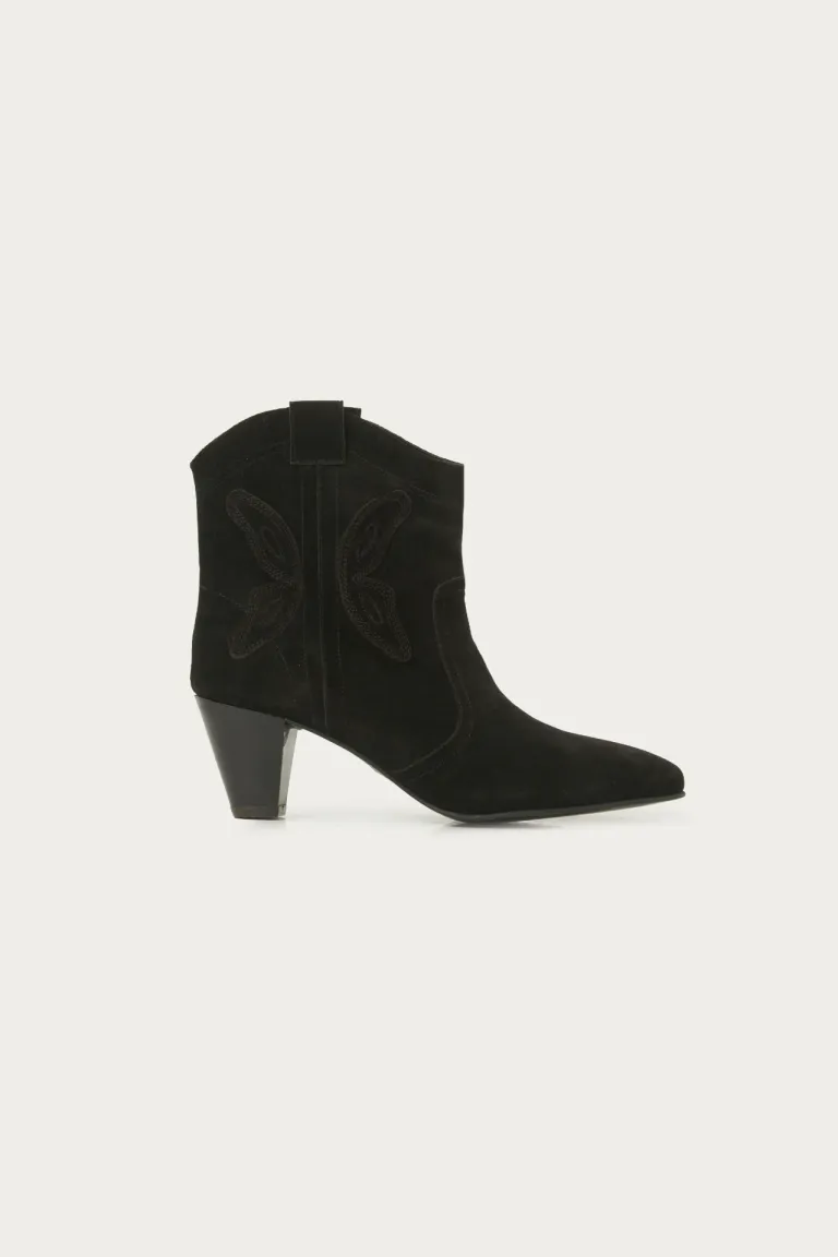 Bota corta de estilo texano con taco medio, caracterizada por su diseño de caña baja y el detalle de recortes laterales con forma de mariposa. Un calzado versátil de terminación gamuzada, ideal para combinar en diversos outfits diarios gracias a su silueta elegante y cómoda, con punta definida y ajuste clásico.