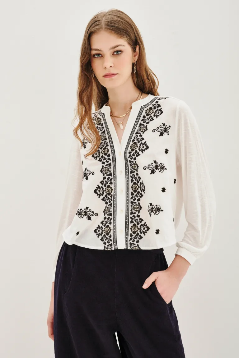 Camisa de manga larga con cuello redondo y bordados frontales de Rapsodia