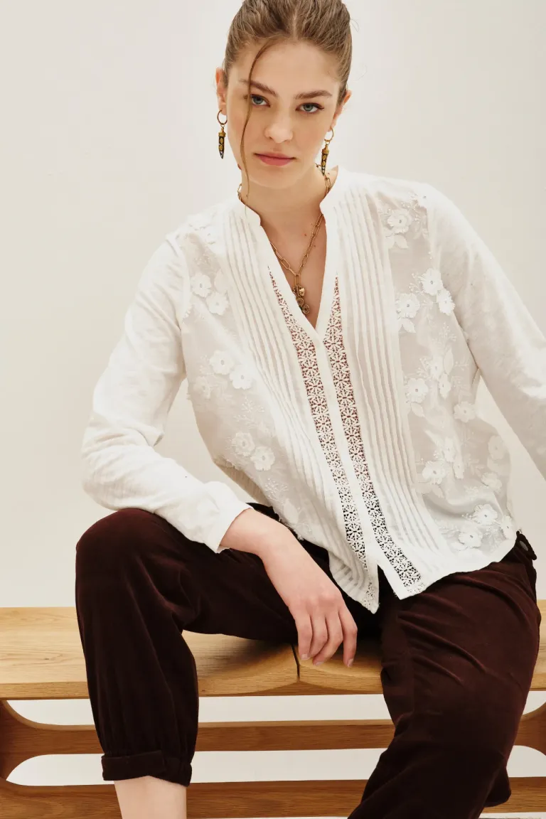 Camisa de corte regular con cuello en V, detalles de alforzas y delicadas aplicaciones de puntilla. Presenta un diseño frontal con bordados florales en relieve, combinando una estructura clásica con elementos decorativos. Ideal para un estilo versátil y femenino.