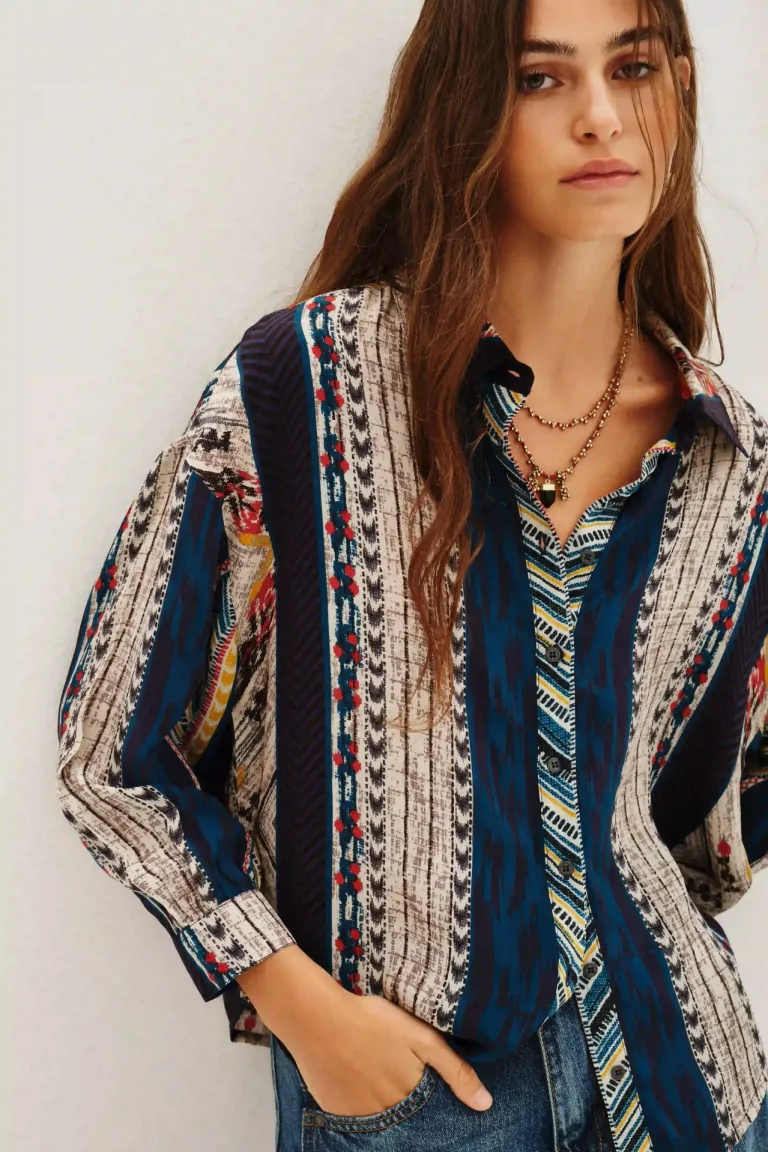 Camisa de corte holgado y diseño fluido con cuello clásico y puños tradicionales. Presenta un patrón multicolor a rayas que recorre toda la prenda. Ideal para crear looks versátiles y cómodos, manteniendo una propuesta elegante y contemporánea para el uso diario en diversas ocasiones.