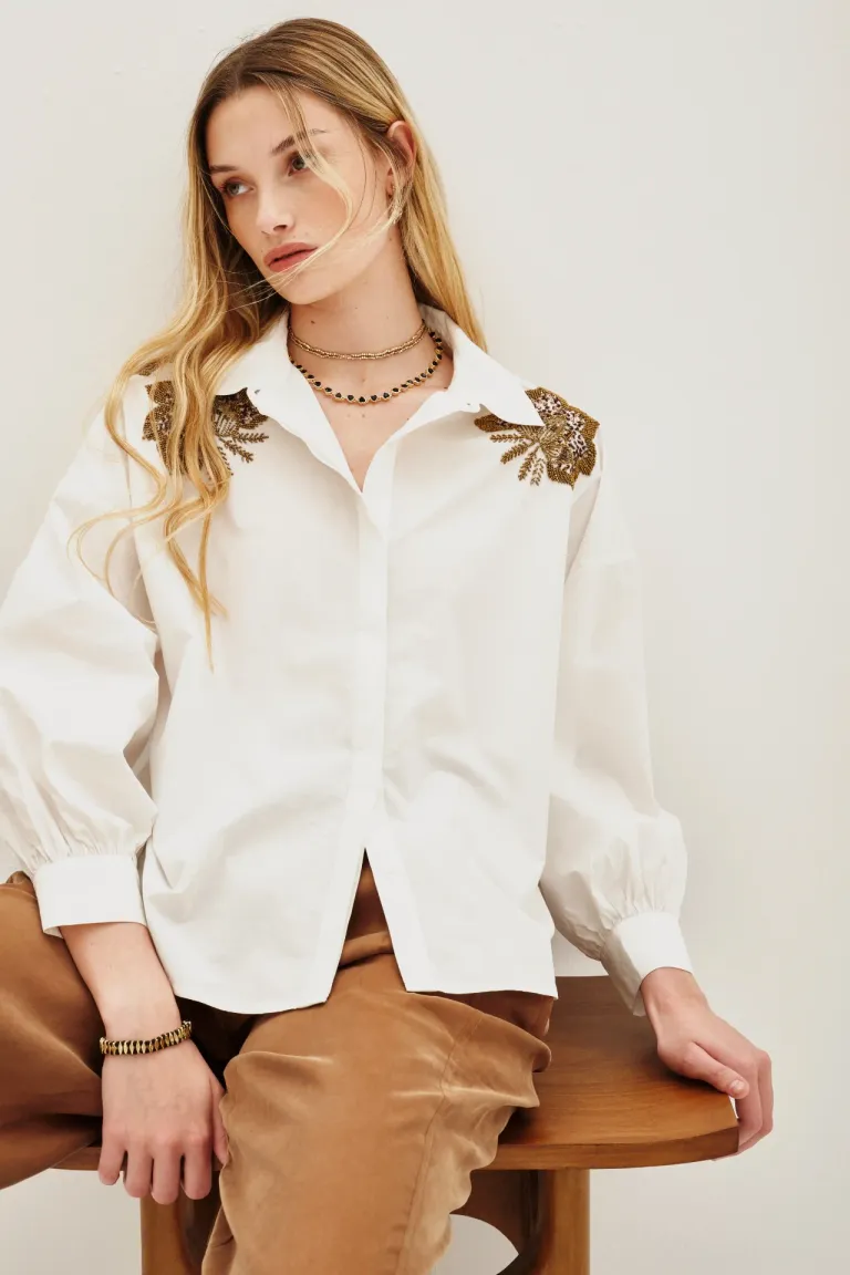 Camisa de manga larga con detalles artesanales de bordado en los hombros. Presenta un corte clásico con cuello camisero, cartera delantera con botones ocultos y puños definidos. Una prenda versátil ideal para integrar en conjuntos formales o informales, ofreciendo un estilo distinguido y cómodo para diversas ocasiones durante todo el año.