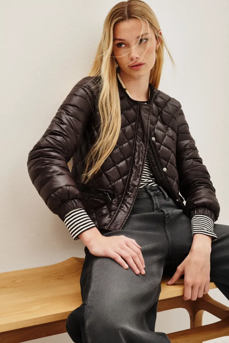 Campera corta acolchada con diseño matelassé en rombos y escote redondo. Cuenta con cierre frontal oculto, bolsillos laterales y terminaciones elásticas en los puños, ofreciendo un ajuste cómodo y funcional. Su silueta versátil es ideal para completar diversos estilos durante los días de temperaturas bajas.