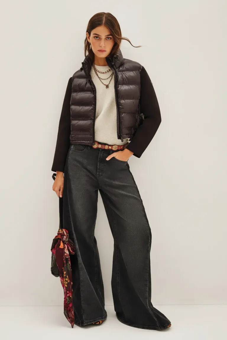 Campera puffer de diseño combinado con cuello alto y cierre frontal. Una prenda versátil ideal para completar equipos urbanos y mantener la comodidad durante los días de bajas temperaturas sin sacrificar el estilo en tus looks diarios.