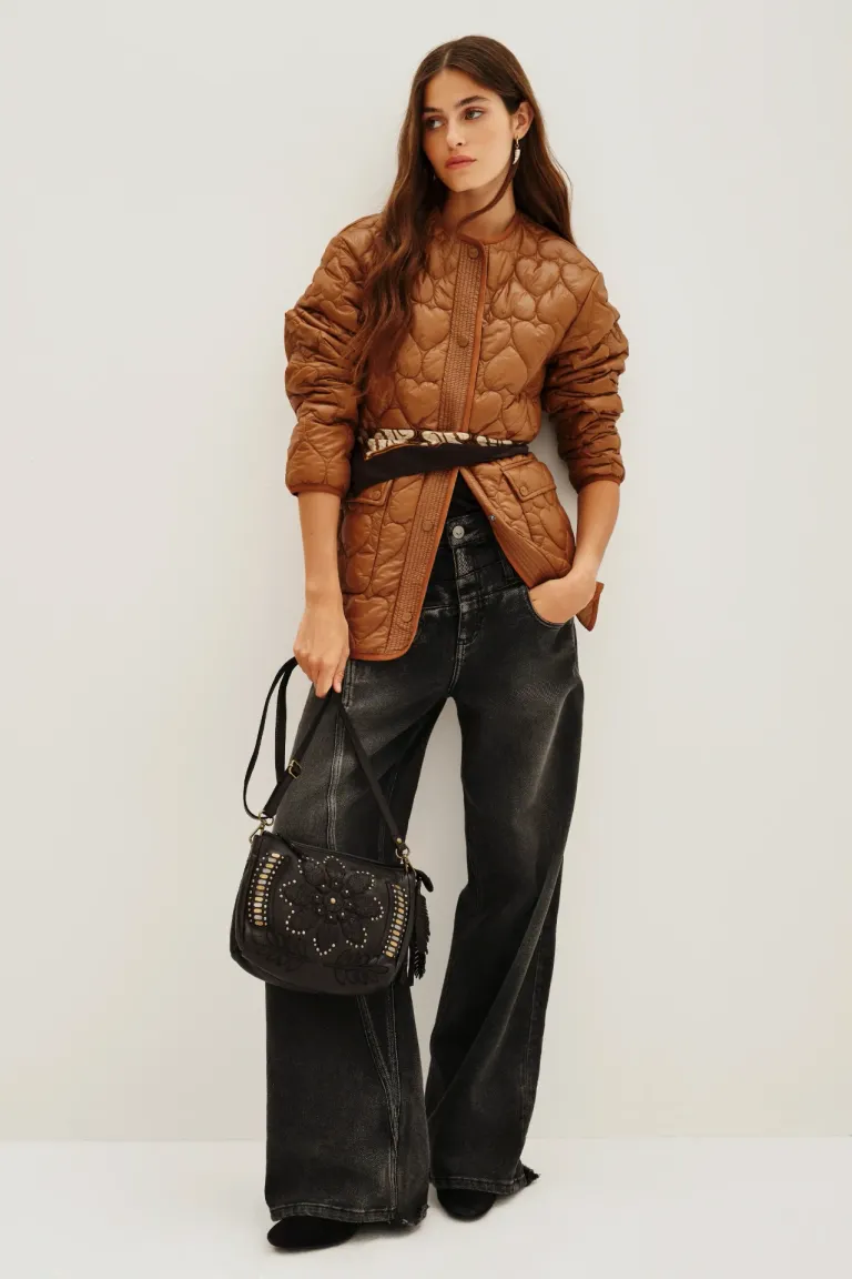 Campera matelassé con diseño de corazones texturizados, cuello redondo y cierre frontal con botones. Presenta un calce relajado y bolsillos frontales con solapa. Una prenda versátil ideal para completar conjuntos casuales de media estación.
