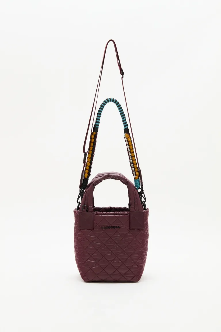 Cartera tote mini con diseño matelassé, manijas cortas y dos correas desmontables, una de ellas con detalle de cordones multicolores. Incluye bolsillos internos para organización y cierre superior. Un accesorio versátil, compacto y práctico para uso diario, con espacio suficiente para artículos esenciales.