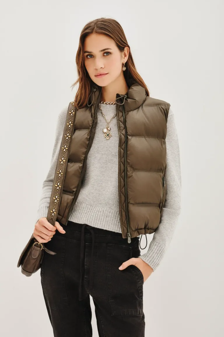 Chaleco acolchado con cierre frontal y cuello alto, ideal para combinar en capas durante los días de clima fresco. Presenta un ajuste regulable en la cintura para mayor comodidad y versatilidad en el uso diario. Diseño moderno que completa cualquier conjunto urbano con estilo y funcionalidad.
