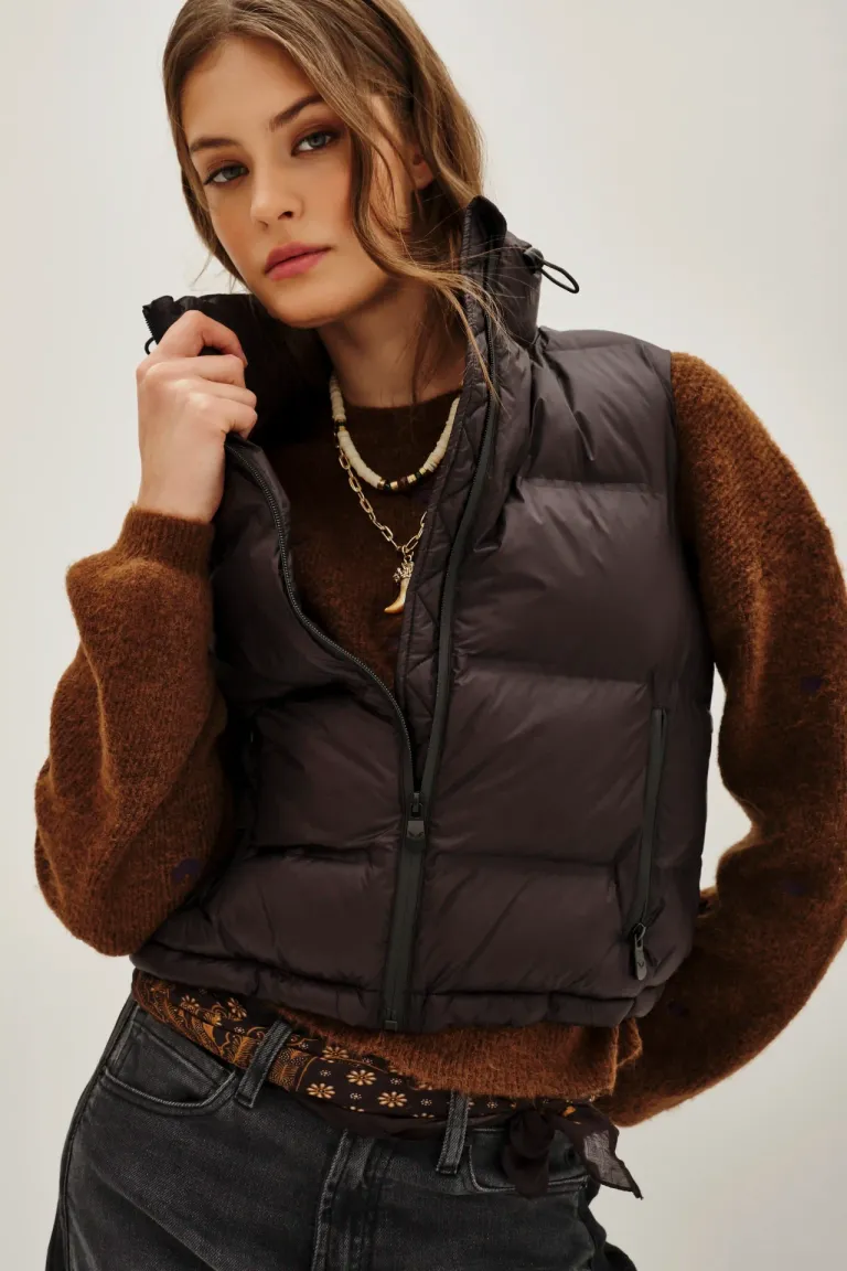 Chaleco acolchado con cuello alto y cierre frontal, diseñado para brindar abrigo adicional. Cuenta con bolsillos laterales con cierre y un ajuste elástico en el ruedo que permite adaptar la prenda según la necesidad. Ideal para complementar looks urbanos y funcionales en los días frescos.