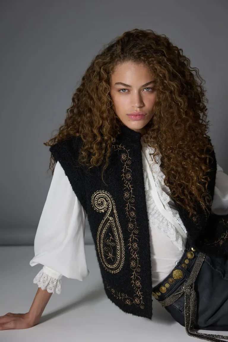 Chaleco sin mangas de estilo étnico con detalles bordados a contratono y cierre frontal con broches invisibles. Una prenda versátil ideal para completar tus looks diarios con un toque distintivo y sofisticado. Presenta un diseño tejido con textura que aporta estilo a cualquier outfit.