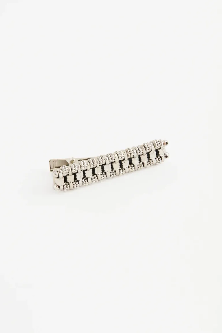 Hebilla para el cabello de diseño rectangular con estructura de eslabones detallados en relieve. Un accesorio práctico y versátil para sujetar el pelo con estilo en diferentes ocasiones cotidianas.