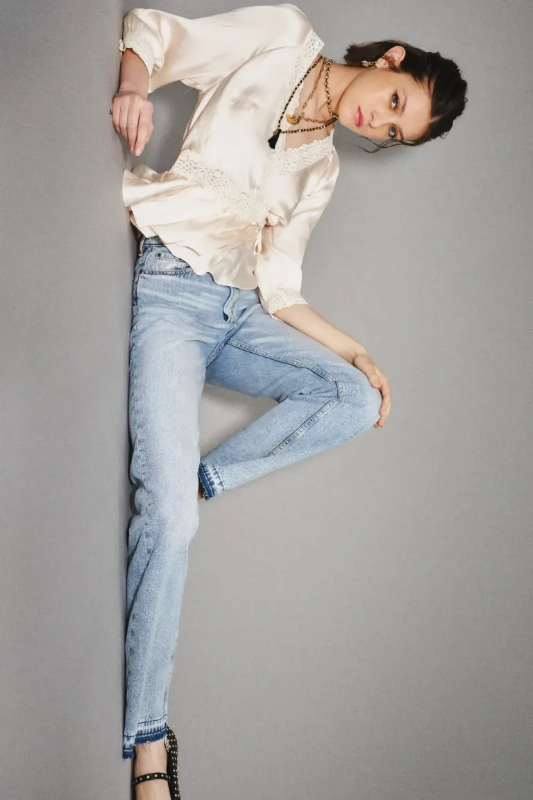 Jean de tiro alto con corte recto. Presenta un diseño de lavado claro con acabado de ruedo desarmado y detalle de bordado en bolsillos traseros. Ideal para un look casual y versátil en el uso cotidiano.