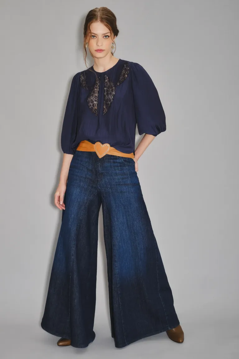 Jean de tiro alto con corte palazzo de pierna ultra ancha. Presenta un diseño sastrero con recortes en el tiro y piernas, brindando gran amplitud y movimiento. Ideal para lograr un estilo sofisticado y cómodo, con cierre y botón, pensado para un ajuste preciso y elegante. Una prenda versátil que se adapta a diversas ocasiones, destacándose por su calce y su estructura moderna.