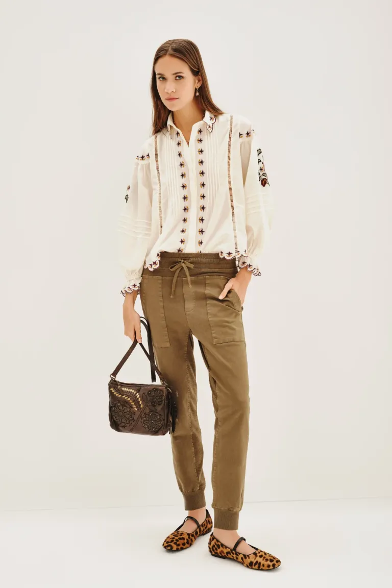 Pantalón estilo cargo de corte recto con cintura elástica regulable mediante cordón. Presenta diseño con bolsillos diagonales frontales y bolsillos traseros con solapa y botón, junto con puños ajustados en los tobillos. Una prenda versátil ideal para integrar en conjuntos casuales de uso diario, ofreciendo un calce cómodo y funcional para diversas ocasiones.