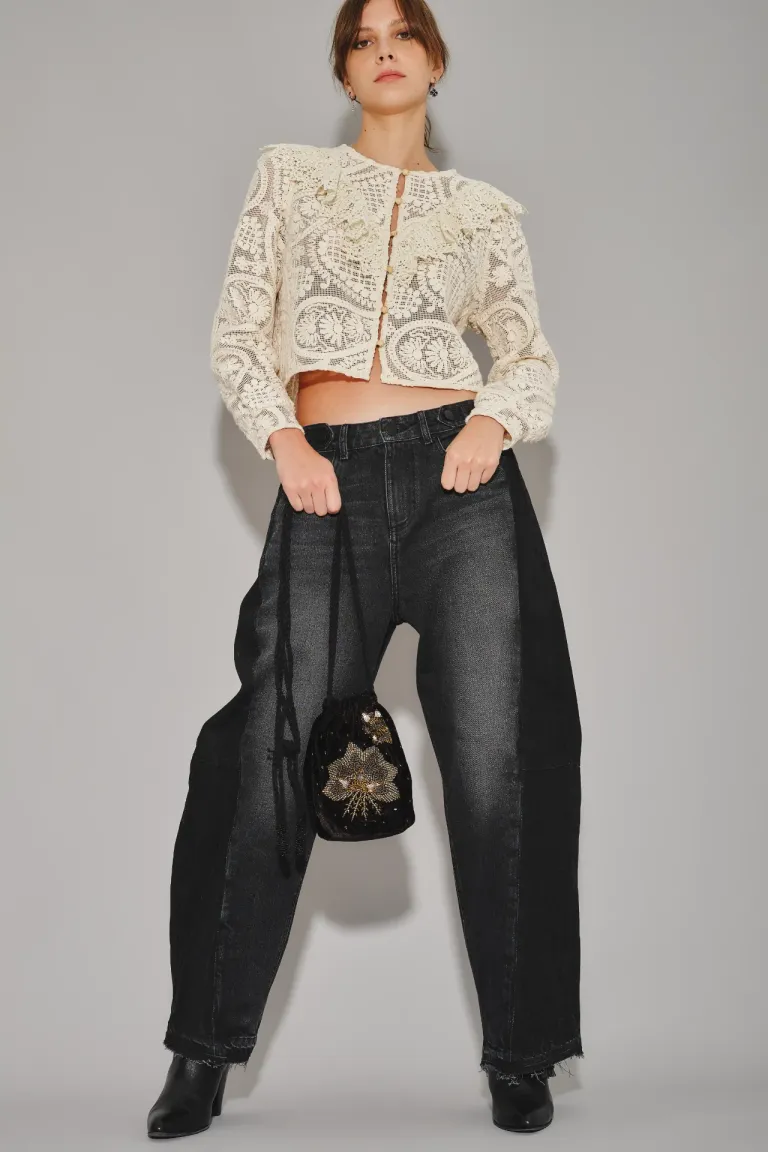 Jean de tiro medio con calce holgado y relajado, caracterizado por sus piernas anchas que se estrechan hacia el tobillo. Presenta recortes laterales a contratono y detalles de charreteras en la cintura con doble botón. Su diseño incluye cierre, botón y forrería interna, ofreciendo una estructura única para un estilo versátil y cómodo en cualquier ocasión.