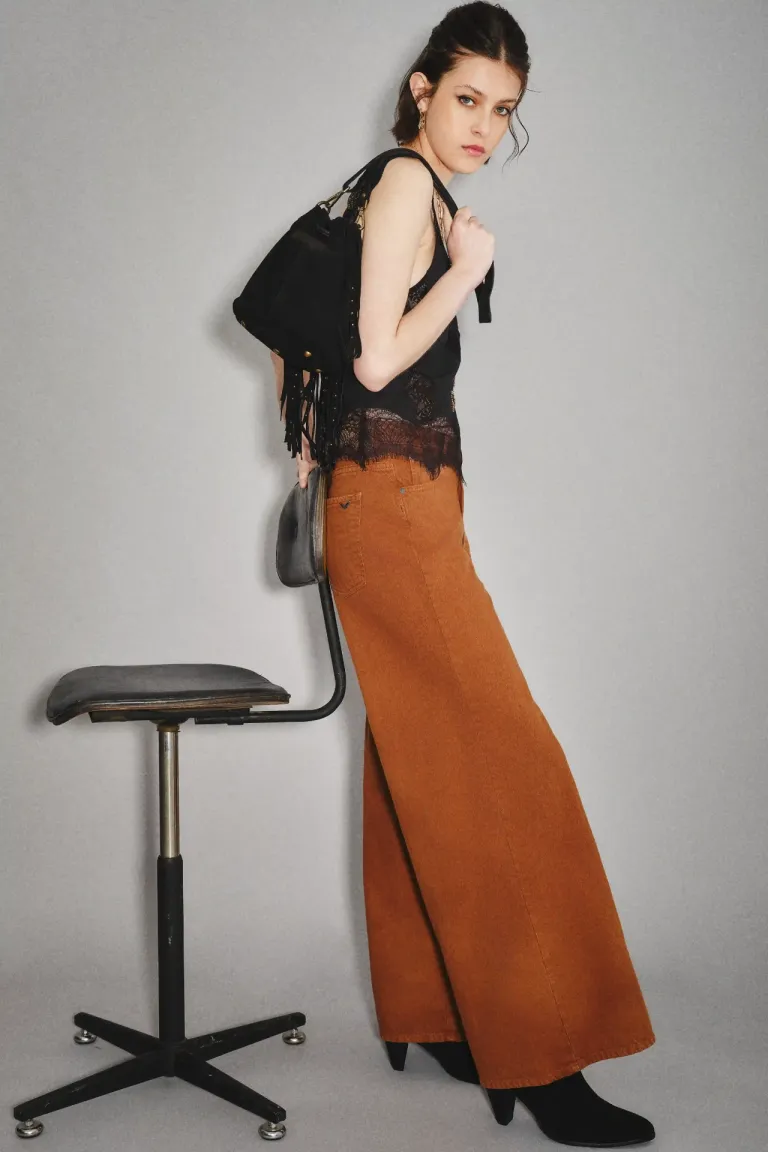 Pantalón de corte oxford con tiro alto que se ensancha gradualmente desde la cadera hacia el ruedo. Presenta una estructura clásica con cierre y botón, ofreciendo un calce cómodo y versátil para diversas ocasiones. Un diseño atemporal ideal para completar cualquier outfit cotidiano con estilo.