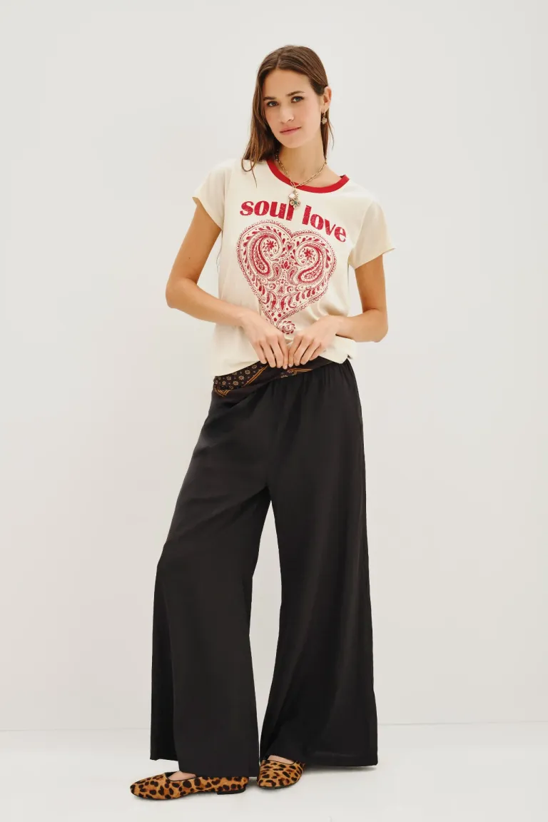 Pantalón de corte palazzo con tiro alto y pierna ancha, diseñado para brindar comodidad y movimiento. Posee cintura elastizada y bolsillos laterales. Un diseño versátil y funcional ideal para completar diversos conjuntos casuales o elegantes en cualquier ocasión.