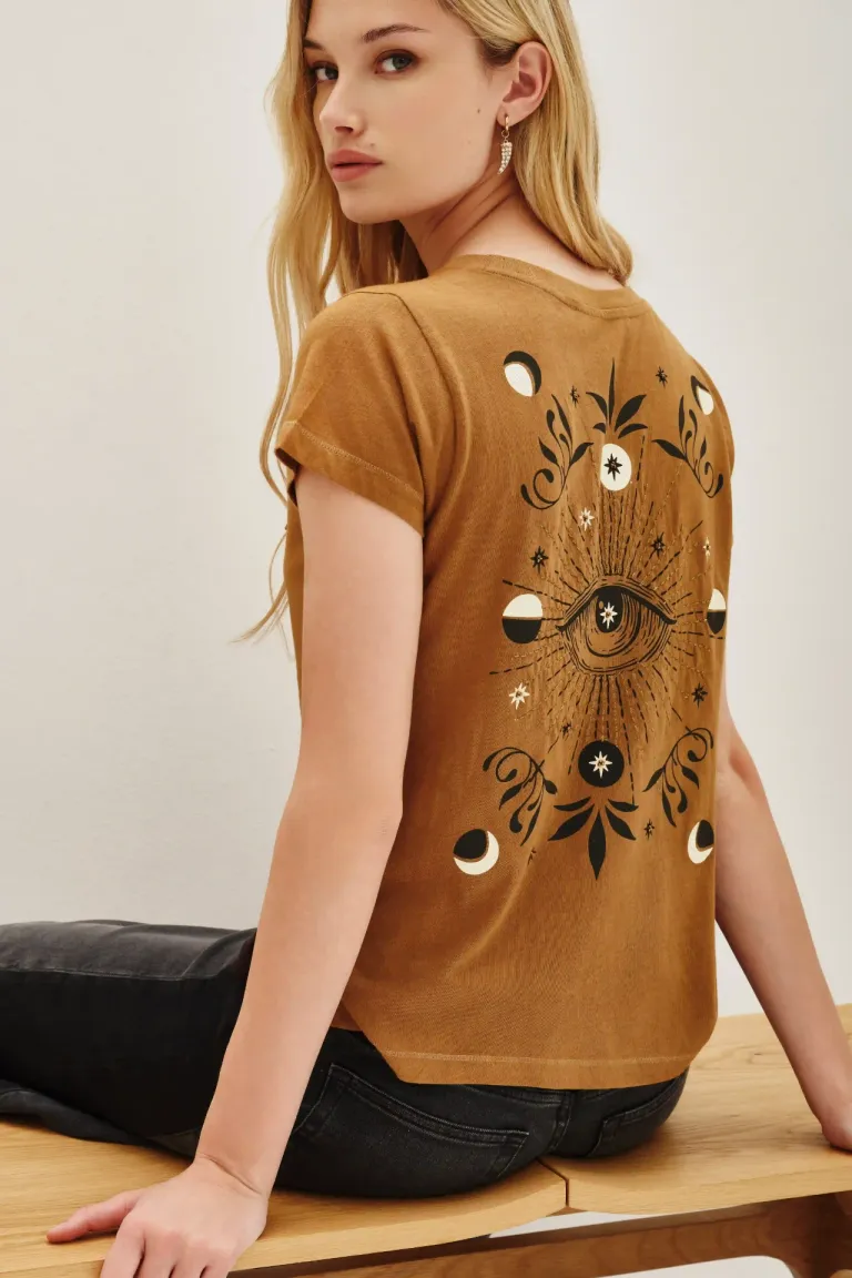 Remera de algodón manga corta con diseño gráfico esotérico en la espalda de Rapsodia
