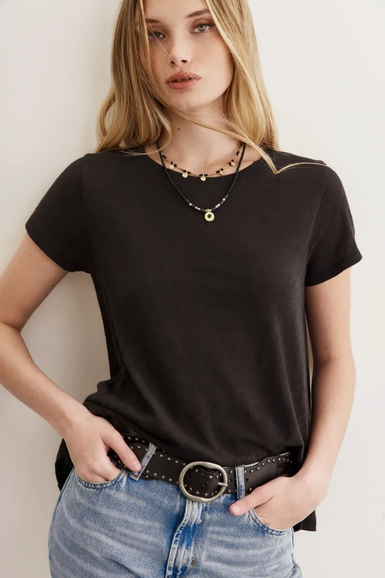 Remera de corte clásico con cuello redondo y mangas cortas. Una prenda versátil, de calce cómodo y ligero, ideal para integrar en múltiples outfits cotidianos con una estética sencilla y atemporal.