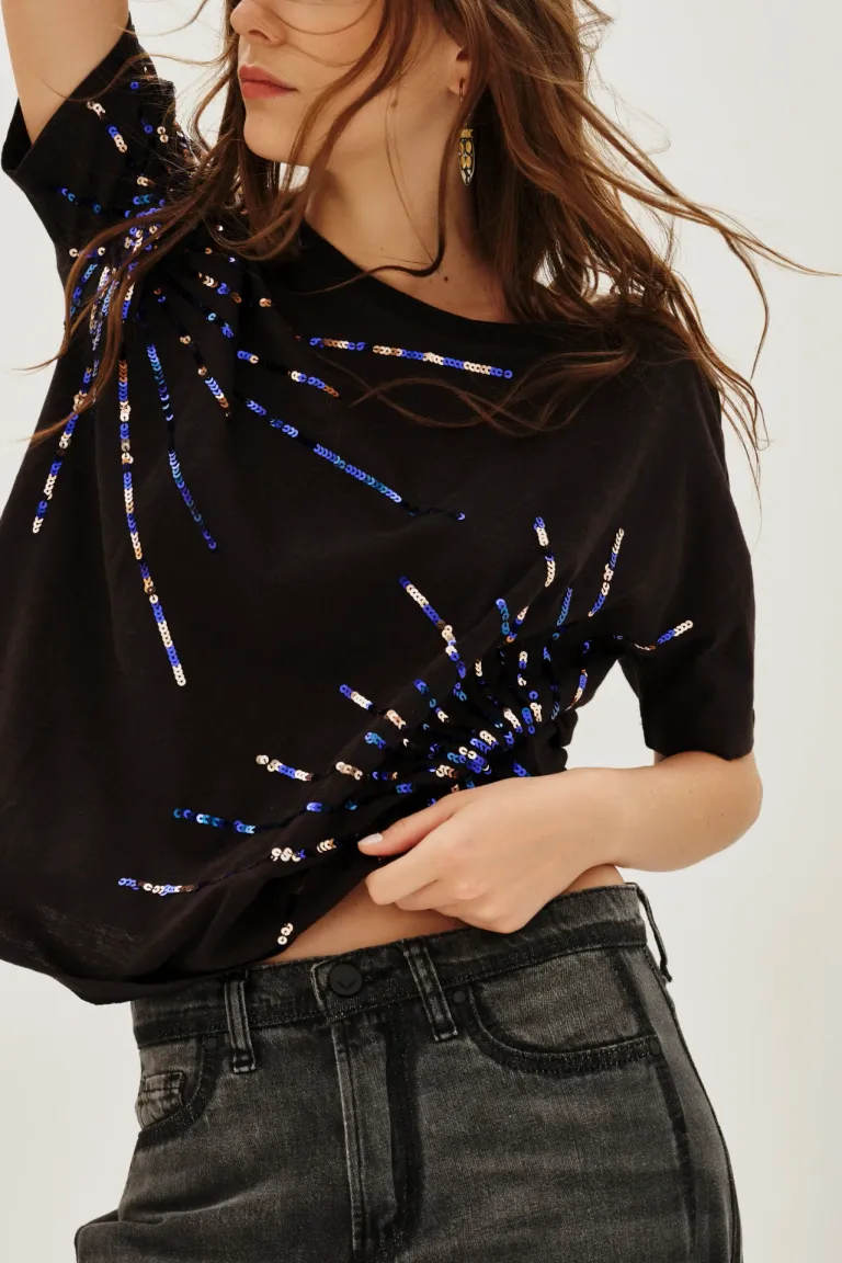 Remera de corte clásico con cuello redondo y mangas cortas. Presenta un detalle de bordado con lentejuelas dispuestas en el frente que aportan textura. Ideal para incorporar en outfits urbanos o de noche, ofreciendo comodidad y un estilo distinguido para uso diario.