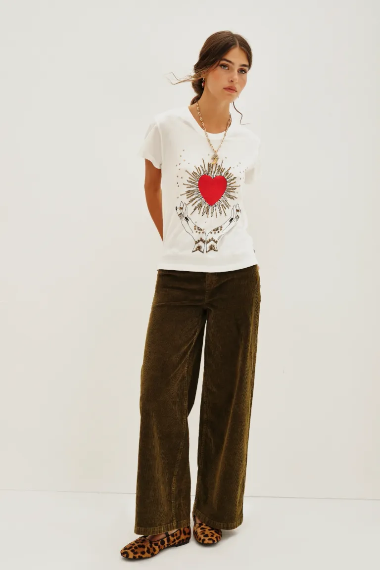 Remera de corte clásico con manga corta y cuello redondo. Presenta un diseño estampado central con motivos esotéricos, realzado con detalles de brillo y texturas que añaden un toque distintivo. Ideal para lograr un look casual y versátil en cualquier ocasión cotidiana. Su diseño es funcional y aporta estilo a conjuntos informales, siendo una pieza clave para renovar el guardarropa de temporada.