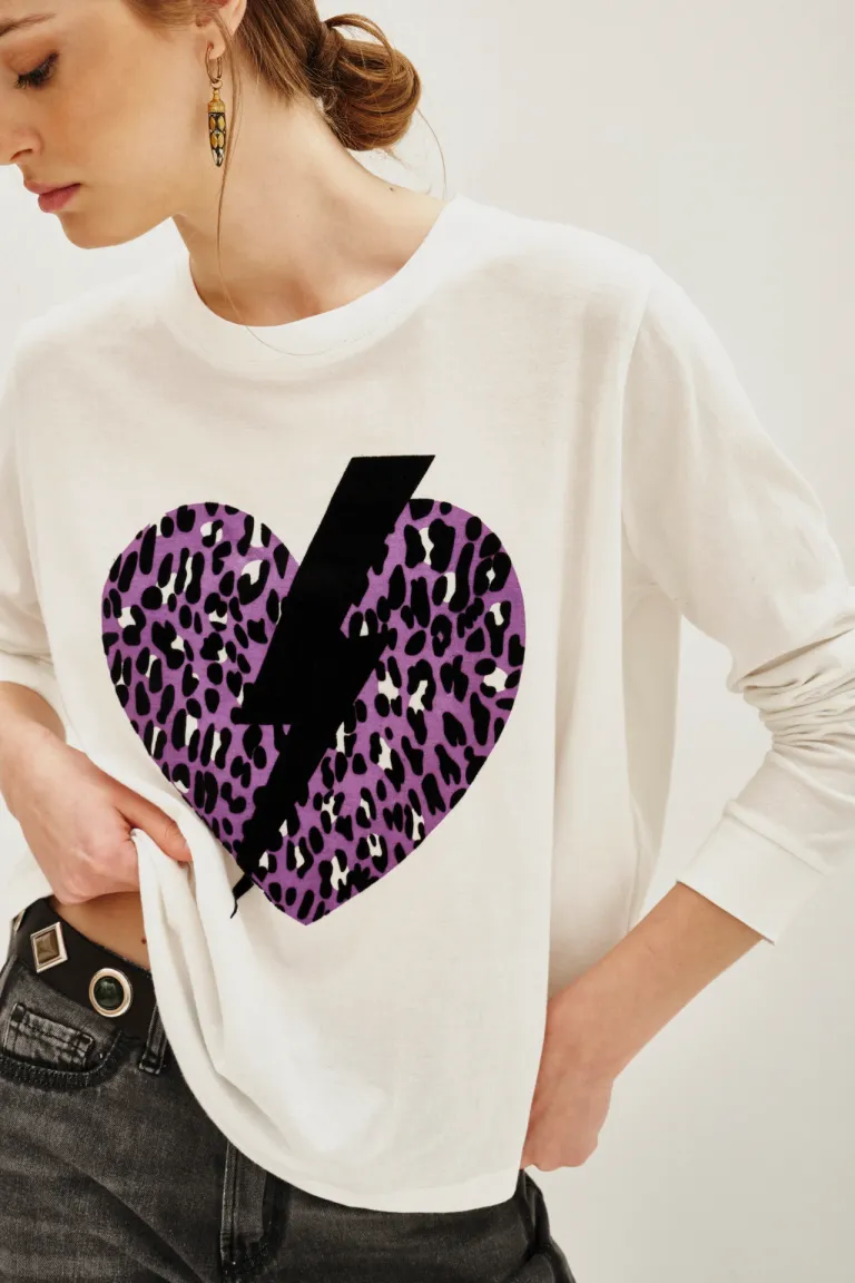 Remera de manga larga con diseño de corazón estampado en animal print y detalle de rayo central. Presenta un cuello redondo clásico y un corte holgado que brinda comodidad. Ideal para un look casual y versátil en el uso diario.
