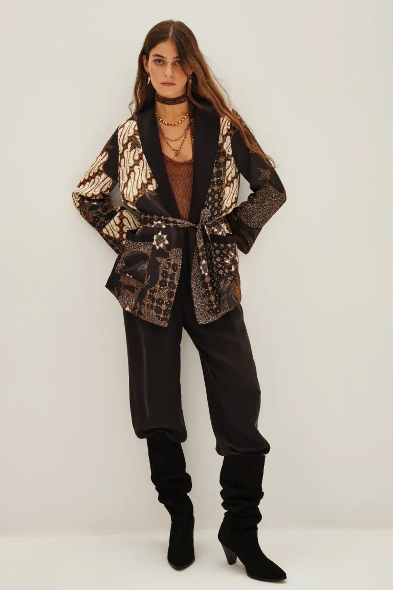 Saco con lazo en la cintura y bolsillos delanteros, diseñado con estampa tipo jacquard y solapas definidas. Una prenda versátil ideal para elevar cualquier conjunto diario, ofreciendo un ajuste cómodo gracias a su lazo regulable en la cintura.