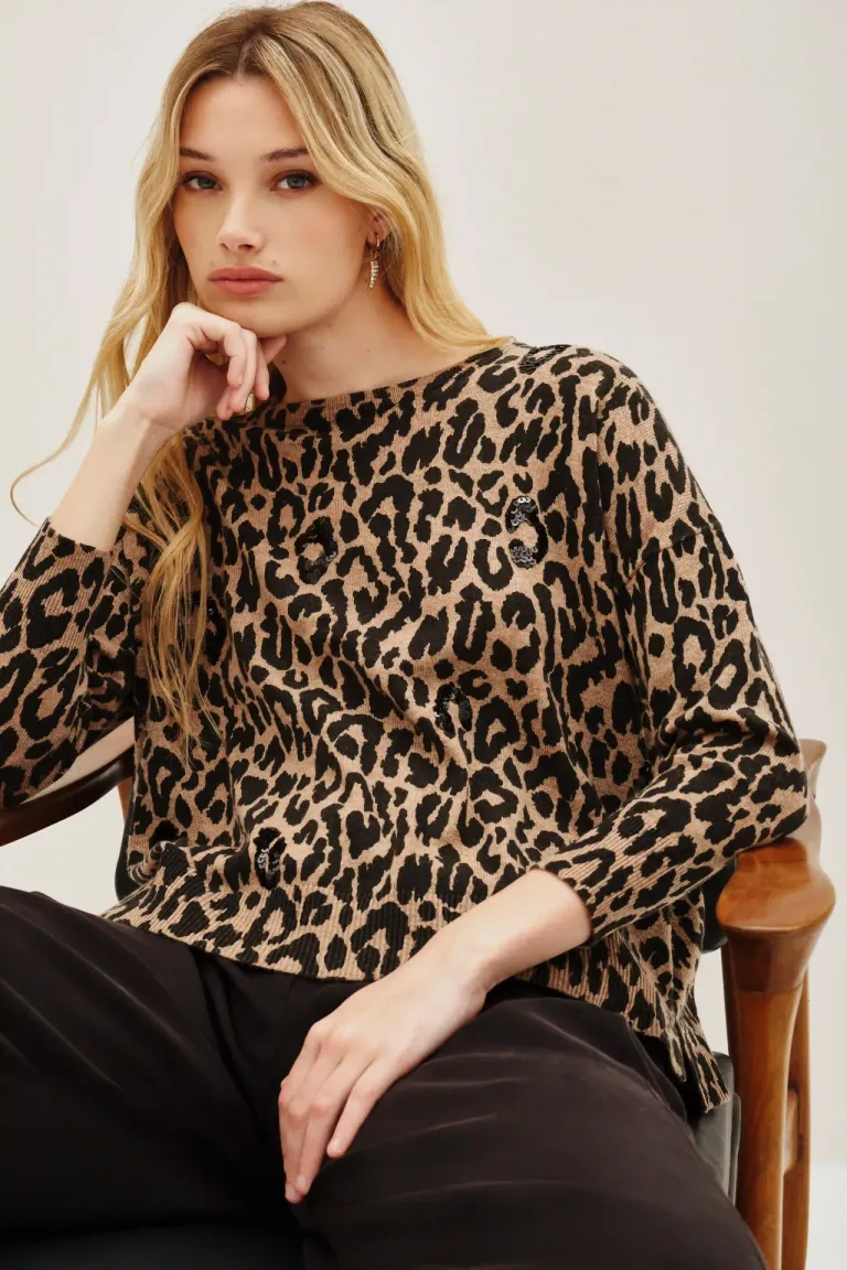 Sweater tejido con estampa animal print, diseño de calce relajado, cuello redondo y tajos laterales en el ruedo. Presenta detalles bordados que aportan un toque distintivo. Ideal para lograr un look moderno y cómodo en diversas ocasiones durante las temporadas de frío.