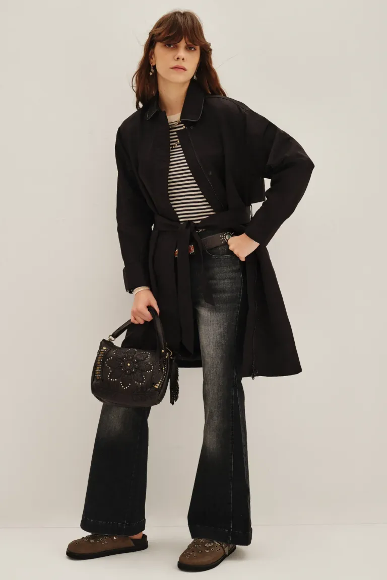 Trench de diseño holgado con cuello clásico, cierre y botones frontales. Presenta lazos de ajuste en cintura y mangas, junto a tajos laterales regulables mediante botones. Ideal para completar looks versátiles de media estación con un estilo funcional y contemporáneo.