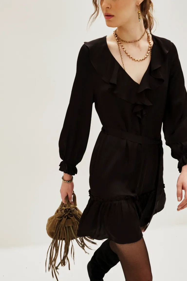 Vestido corto de mujer con diseño de manga larga, escote en V con detalle de volados y lazo en la cintura para ajuste. La prenda cuenta con puños elásticos y un volado en el ruedo que aporta movimiento. Ideal para un look versátil y elegante para diversas ocasiones durante el día o la noche.