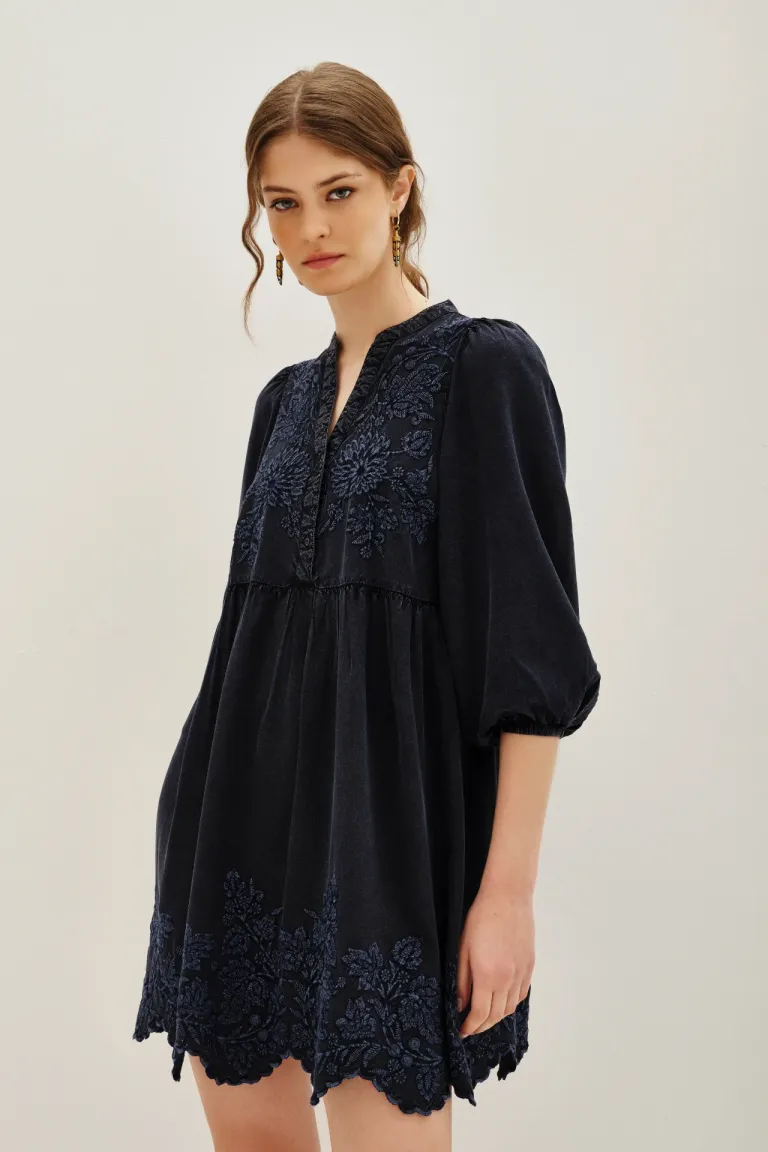 Vestido corto de diseño suelto con cuello mao y cartera en V con botones. Presenta mangas tres cuartos con terminación balloon y puños elásticos. El diseño destaca por su bordado floral a tono aplicado sobre el pecho y el ruedo irregular. Una prenda cómoda y versátil ideal para un estilo urbano y sofisticado.