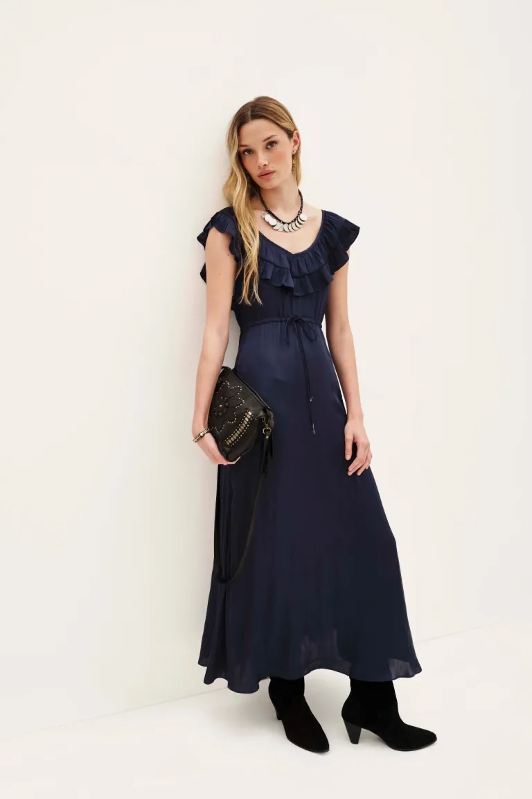 Vestido largo con volados en el escote y ajuste en la cintura mediante cordón. Presenta un diseño fluido con escote redondo tanto en el frente como en la espalda, brindando un calce cómodo y versátil. Ideal para complementar con diversos accesorios, este modelo destaca por su caída natural y diseño atemporal.