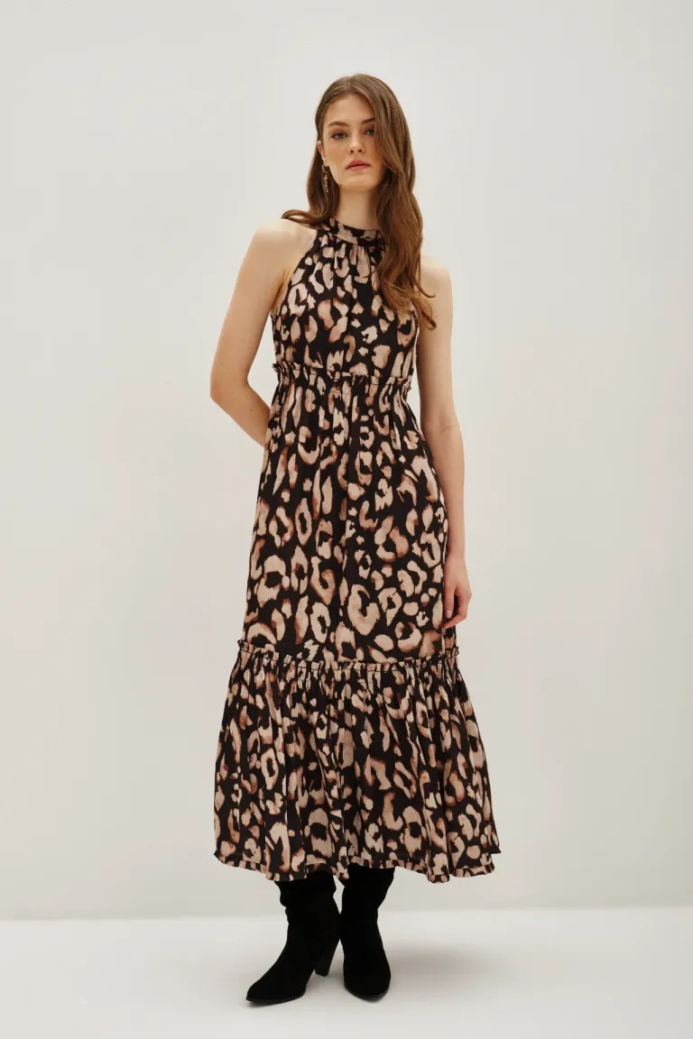 Vestido largo con diseño animal print, presenta escote halter con detalle de volados y ajuste en la cintura mediante costuras elásticas. La falda incluye un volado en el ruedo, aportando movimiento a la prenda. Una opción versátil y distinguida para diversas ocasiones, ideal para combinar con botas o calzado formal en looks de temporada.