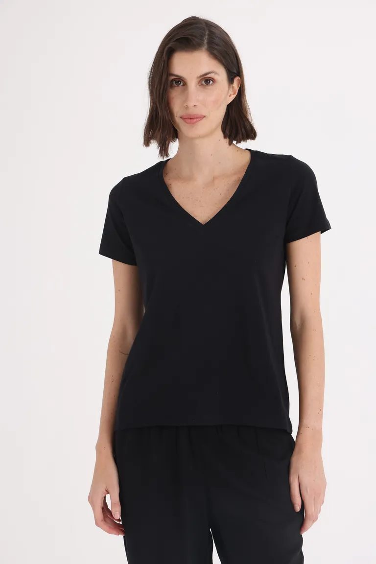 Esta prenda versátil y moderna es ideal para crear un look casual y elegante. Cuenta con un escote en V que estiliza el cuello y mangas cortas que brindan comodidad. Su corte recto y largo a la cadera la convierten en una opción cómoda y favorecedora para diferentes ocasiones. Combínala con jeans, pantalones o faldas para lograr diferentes estilos.