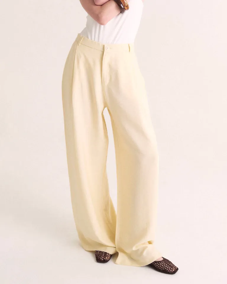 Pantalón de pierna ancha con elegantes pliegues frontales y detalles de fruncido en la espalda. Diseño sofisticado que incluye prácticos bolsillos laterales y cierre frontal con cremallera y botón. El corte holgado ofrece máxima comodidad mientras mantiene un aspecto elegante y versátil para cualquier ocasión.
