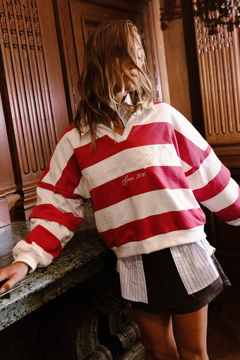 Buzo de estilo deportivo con diseño de rayas anchas horizontales y cuello polo. Presenta un corte oversize con calce relajado y cómodo, ideal para un look casual y urbano. Incluye detalles bordados al frente que destacan en la prenda. Un modelo versátil perfecto para combinar en diversas ocasiones aportando un toque distintivo a tu estilo cotidiano.